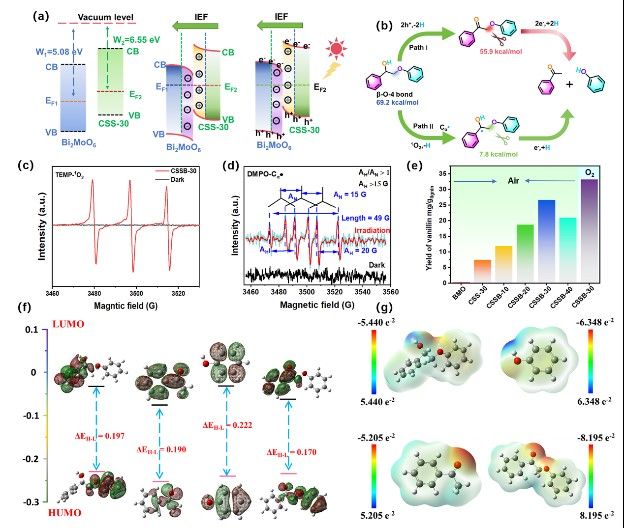 如圖所示,S型異質結的構建可以保持高氧化還原電位并改善電荷分離,從而實現高效光催化反應。在Cβ-O鍵的裂解過程中,S型的電荷流動方式促進了1O2的生成,誘導Cα?自由基的生成。在此過程中Cβ-O鍵的解離能從69.2 kcal/mol大幅衰減到7.8kcal/mol,這一過程促進了Cβ-O的劈裂,從而促進高值化轉化。此外,為了驗證CSSB-30光催化劑對實際木質素中Cβ-O帶的裂解能力,以馬尾松堿木質素為底物,堿木質素Cβ-O裂解的典型產物為香蘭素,獲得了26.6 mg/木質素的香蘭素高產率,證明了堿木質素中Cβ-O鍵的有效裂解。