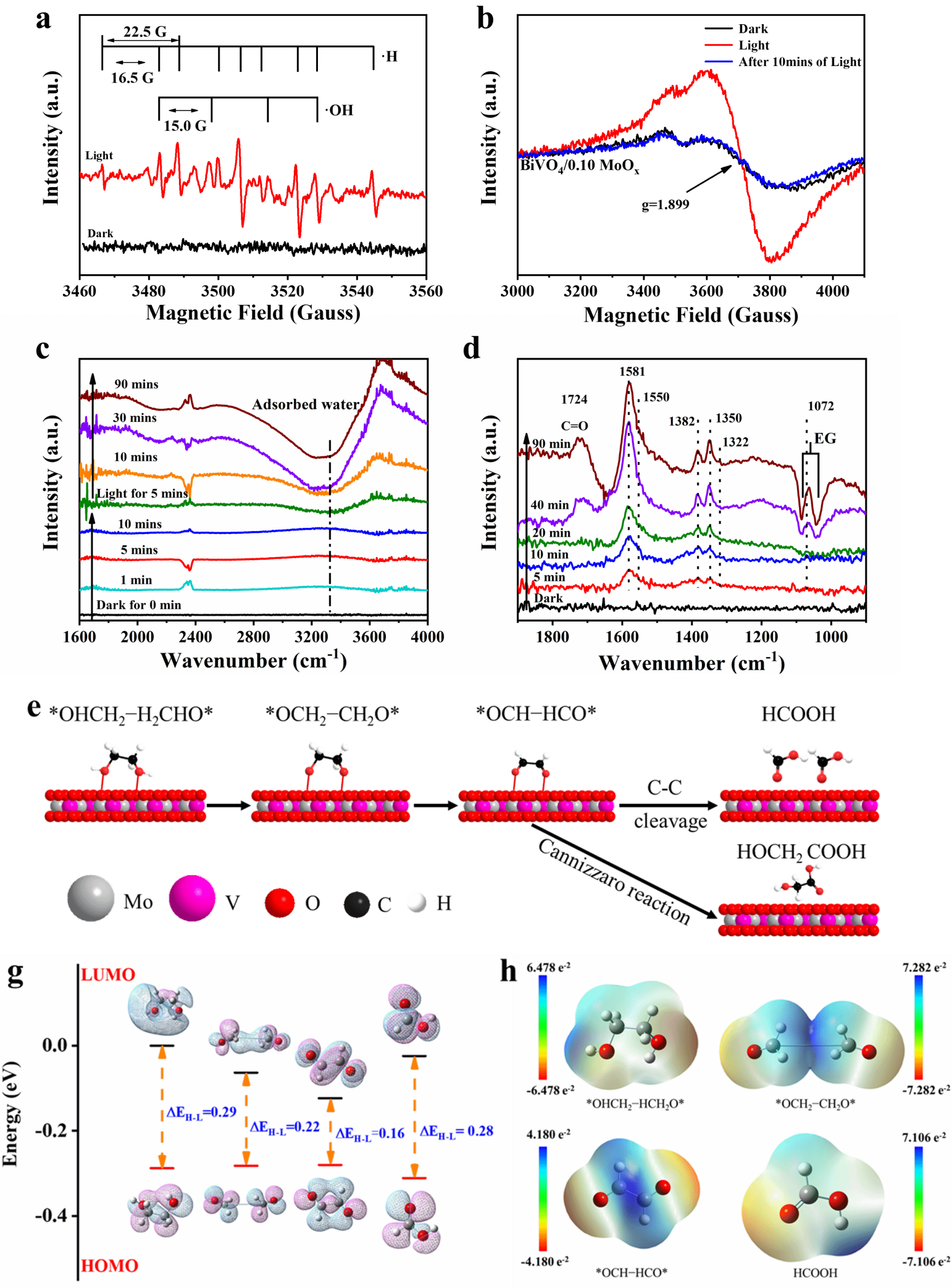 在PET的光重整過程中,MoOx的引入會誘導BiVO4的光生電子向其遷移,在此過程中Mo6+將被還原為Mo5+,這一過程促進了H自由基的生成,從而促進產氫。此外,EG在反應過程中逐步地被轉化為乙二醛及乙二酸,最終形成甲酸并穩定存在。