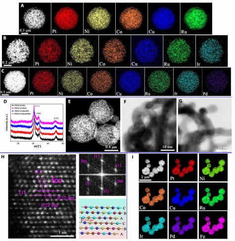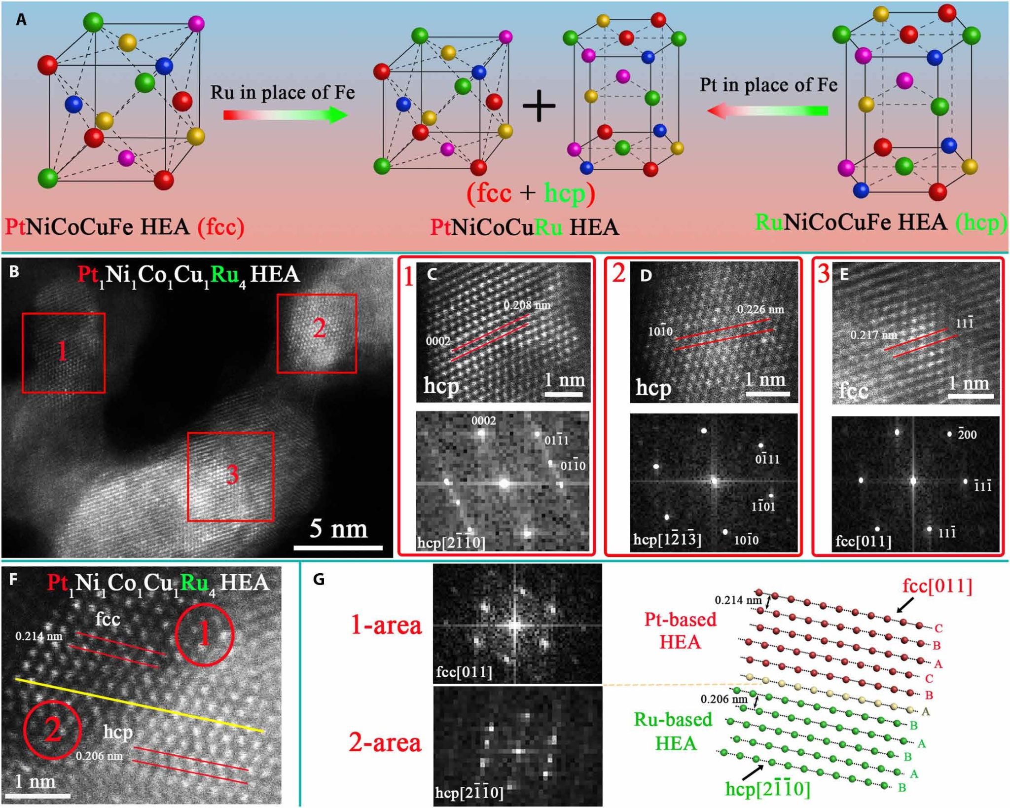團隊還深入探究了相關形成機制,發現 Pt、Ru、Ir 等貴金屬元素可降低過渡金屬還原溫度,促進單相固溶體形成,為優化材料性能提供理論依據。同時,通過調整 Pt 與 Ru 比例和還原溫度,借助原位掃描透射電子顯微鏡和密度泛函理論計算,首次實現同一納米顆粒中 fcc 和 hcp 相結構的精確調控,為定制材料性能創造可能。