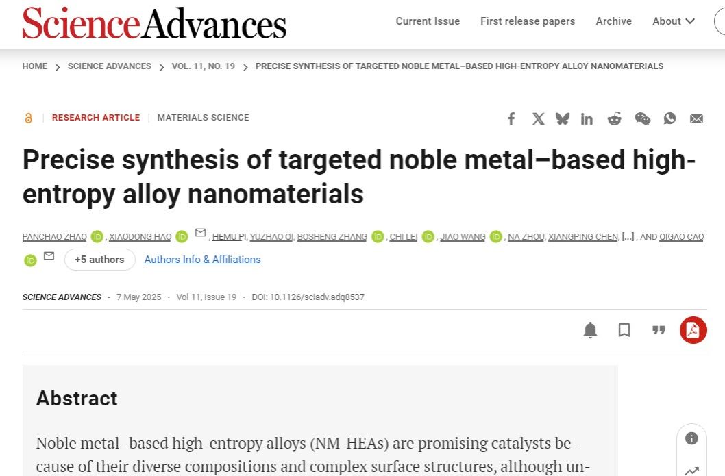 附論文詳細信息:P. Zhao, X. Hao*, H. Pi, Y. Qi, B. Zhang, C. Lei, J.Wang, N. Zhou, X. Chen, D. Kan*, B. Xu, G. Zhang*, J. Chen*, W. Yi*, Q. Cao*. Precise synthesis of targeted noble metal–based high-entropy alloy nanomaterials, Science Advances, 11, eadq8537 (2025).