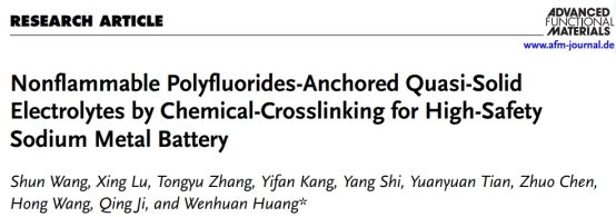 基于上述問題,近日,陜西科技大學化學與化工學院黃文歡教授團隊設計并制備了氟修飾固態薄膜,以同時調控鈉離子傳輸和固體電解質界面(SEI)的形成。研究表明基于該固態薄膜的鈉金屬扣式/袋式電池均表現出高循環穩定性(在0.5/1 C下, 4000/2000循環后,容量分別為86.9和80.0 mAh g-1)。此外,該薄膜能夠在高溫條件下分解產生氟清除自由基,能夠有效阻斷電池熱失控時的燃燒鏈式反應,從而防止電池二次燃燒。研究成果發表于學術期刊Advanced Functional Materials,題為“Nonflammable Polyfluorides-Anchored Quasi-Solid Electrolytes by chemical-crosslinking for High-Safety Sodium Metal Battery”。