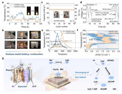 圖5:基于PCUF電解質準固態鈉金屬軟包電池高溫性能,ARC測試及電池阻燃機理