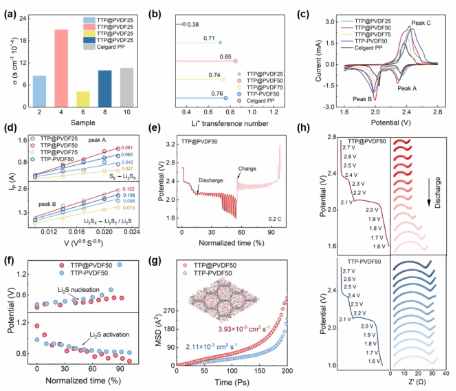 圖3. (a,b) SS|TTP@PVDF (75-25)/TTP-PVDF50/PP|SS的鋰離子電導(dǎo)率及Li+遷移數(shù);(c) S@CNT||Li 電池CV;(d) TTP@PVDF50與TTP-PVDF50電池的CV峰值電流與掃描速率平方根的關(guān)系;(e) TTP@PVDF50電池的GITT曲線;(f) TTP@PVDF50與TTP-PVDF50電池的內(nèi)阻對(duì)比;(g) Li+和COF的均方位移隨模擬時(shí)間的變化關(guān)系;(h) TTP@PVDF50與TTP-PVDF50電池的原位電化學(xué)阻抗.