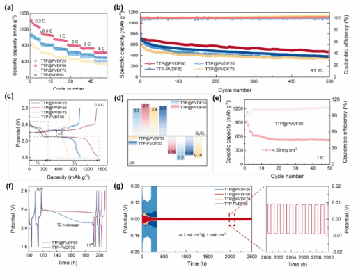 圖5. S@CNT|TTP@PVDF(25-75)|Li的 (a) 倍率性能 (b) 2 C電流密度下的長(zhǎng)循環(huán)性能及 (c) 倍率充放電曲線;(d) TTP@PVDF50與TTP-PVDF50電池在0.2 C電流密度下的高放電平臺(tái)容量(Q2)與低放電平臺(tái)容量(Q1)分析;(e) 高負(fù)載S@CNT|TTP@PVDF50|Li電池循環(huán)性能;(f) S@CNT|TTP@PVDF50/ TTP-PVDF50|Li的自放電性能;(g) 組裝的Li||Li對(duì)稱電池性能(插圖為選定循環(huán)區(qū)間的局部放大圖)。