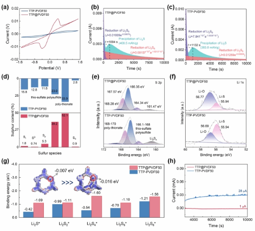 圖4. (a) Li|TTP@PVDF50|Li and Li|TTP-PVDF50|Li電池的CV圖;(b,c) Li2S形核與沉積曲線; (d,e,f) 多硫化物沉積后TTP@PVDF50與TTP-PVDF50的S 2p和Li 1s元素XPS譜圖;(g) TTP@PVDF50和TTP-PVDF50與多硫化物(LiPSs)的結(jié)合能強(qiáng)度對(duì)比及靜電勢(shì)分布圖(插圖);(h) 穿梭電流測(cè)試。
