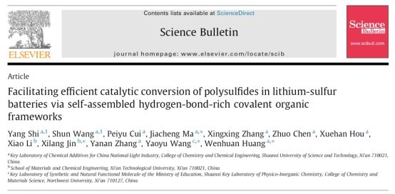 文章信息: Shi Y, Wang S, Cui P, et al. Facilitating efficient catalytic conversion of polysulfides in lithium-sulfur batteries via self-assembled hydrogen-bond-rich covalent organic frameworks. Science Bulletin, 2025, 70(13). https://doi.org/10.1016/j.scib.2025.05.005