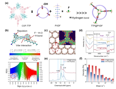 圖2. (a) TTP COF與PVDF氫鍵交聯(lián)示意圖。(b) TTP@PVDF50的RDG和Sign(??2)??函數(shù)關(guān)系圖。(c) 共價(jià)有機(jī)框架差分電荷密度。(d) TTP@PVDF50、TTP-PVDF50、PVDF和TTP的傅里葉變換紅外光譜(FT-IR)。(e) TTP@PVDF50的固態(tài)核磁共振氫譜(1H NMR). (f) TTP@PVDF50與TTP-PVDF50的粘度隨剪切速率變化曲線.