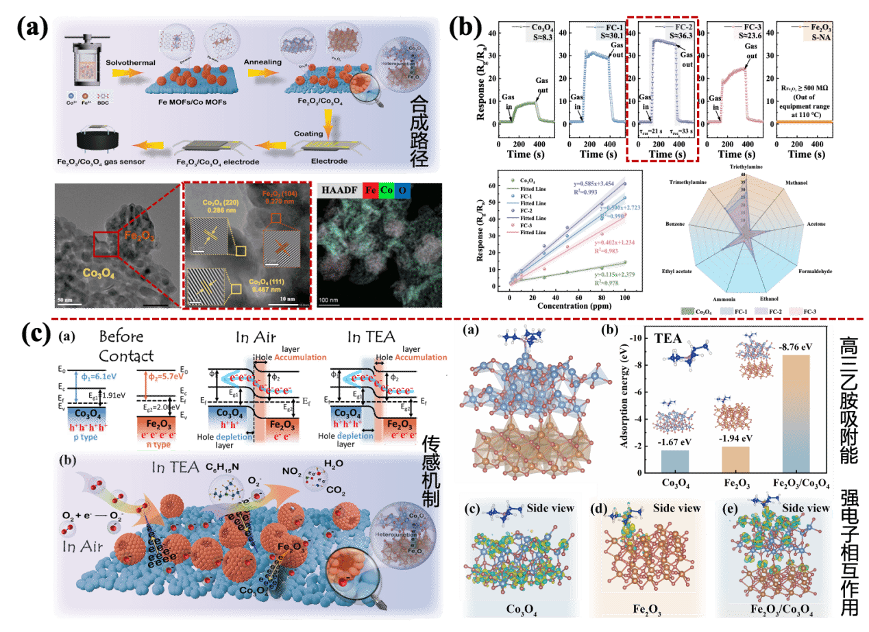 本研究聚焦“如何解決氣體傳感器在更低工作溫度下快速識別異味”這一全球關注的熱點難題,首次實現了Fe2O3納米球與Co3O4納米網原位構建p-n異質結結構,構建出一種新型三維交聯納米復合材料。該傳感器材料能夠在比以往更低的工作溫度下(110 °C),實現對典型異味氣體三乙胺的高靈敏檢測,其響應值是傳統材料的4倍以上,響應/恢復時間也縮短至半分鐘以內,達到目前國際同類技術的領先水平。研究團隊通過理論模擬和實驗分析,從微觀層面揭示了材料性能提升的根本原因,發現Fe2O3與Co3O4在界面處原位形成穩定的異質結,有效促進電荷分離與遷移,提升了氣體分子的吸附效率與表面反應活性,從而實現了更快速、更靈敏的信號輸出。