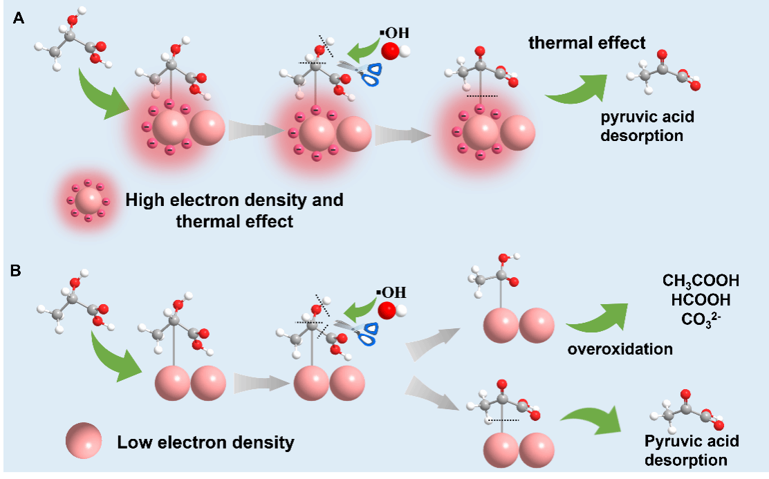 利用光催化方式將聚乳酸(PLA)塑料轉(zhuǎn)化為丙酮酸學(xué)品,對(duì)開發(fā)環(huán)境友好且經(jīng)濟(jì)可行的回收技術(shù)、推動(dòng)碳循環(huán)經(jīng)濟(jì)發(fā)展具有重要意義。然而,乳酸催化脫氫生成丙酮酸的過程中,乳酸分子在催化劑表面的吸附太強(qiáng)會(huì)導(dǎo)致產(chǎn)物無法脫附,引發(fā)丙酮酸C?C鍵的斷裂從而被過度氧化的問題。同時(shí)由于羥基氧化為羰基的活化能較高,導(dǎo)致該反應(yīng)效率及選擇性較低。因此,當(dāng)前的關(guān)鍵挑戰(zhàn)在于如何有效增強(qiáng)乳酸中的C?C鍵強(qiáng)度激活α?OH的同時(shí),促進(jìn)丙酮酸產(chǎn)物在催化劑表面的脫附過程。