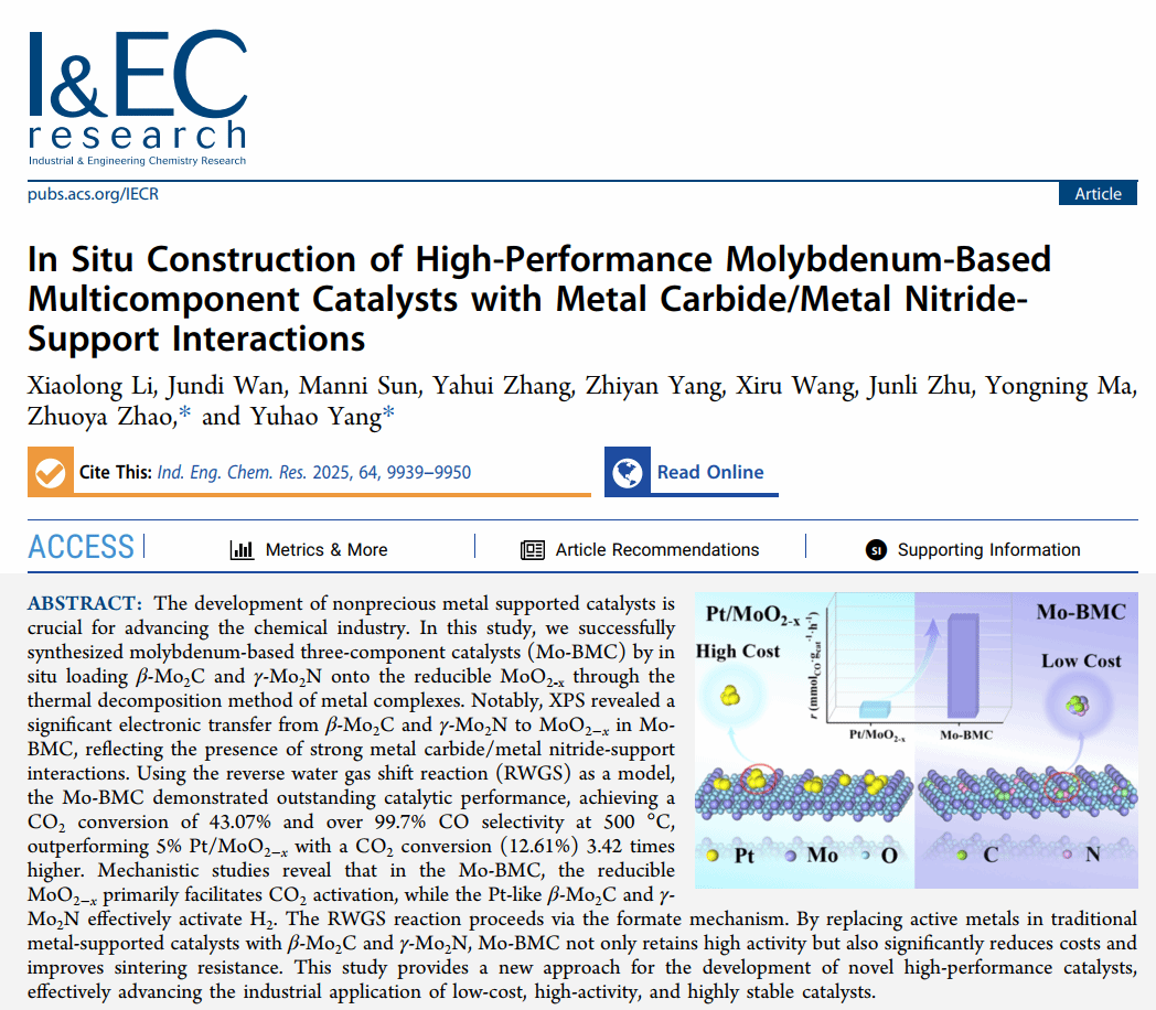 團隊采用金屬絡合物原位熱分解法,在可還原載體MoO???上原位生成β-Mo?C與γ-Mo?N,成功構建出具有類貴金屬特性的鉬基三組分催化劑—Mo-BMC。以逆水煤氣變換反應(RWGS)為模型反應,Mo-BMC在500 °C下實現CO?轉化率43.07%、CO選擇性超99.7%,性能為同條件下5%Pt/MoO???的3.42倍。機理研究標明MoO???是CO?的活性中心,而β-Mo?C和γ-Mo?N是H?的活性中心,反應經甲酸鹽路徑進行。該策略以非貴金屬替代傳統金屬活性中心,展示了以類貴金屬化合物替代傳統貴金屬的有效途徑,在保證催化性能的同時降低催化劑成本、提高抗燒結穩定性方面具有顯著優勢。研究成果以題為 “In Situ Construction of High-Performance Molybdenum-Based Multicomponent Catalysts with Metal Carbide/Metal Nitride-Support Interactions” 發表在《Industrial & Engineering Chemistry Research》。該工作主要由2022級碩士研究生萬俊弟完成。https://doi.org/10.1021/acs.iecr.5c00319