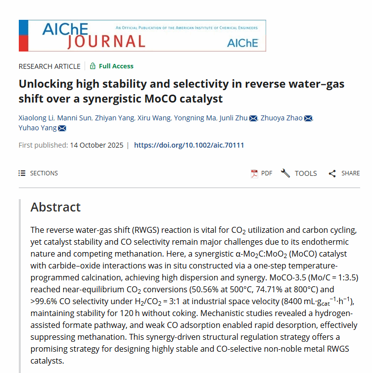 團隊通過一步控溫焙燒法原位構建碳化物–氧化物協同體系(α-Mo?C:MoO?),形成高分散MoCO復合界面。MoCO-3.5在CO?/H? = 1:3條件下,于800 °C實現74.71% CO?轉化率和超過99.6%的CO選擇性,在工業級反應空速下具有優異穩定性且無積碳生成。機理研究表明該催化劑遵循氫輔助的甲酸鹽反應機理。CO的快速脫附有效抑制了CO在催化劑表面被深度加氫生成甲烷。該成果為開發高穩定、高選擇性、非貴金屬催化劑提供了新思路。研究以“Unlocking high stability and selectivity in reverse water-gas shift over a synergistic MoCO catalyst”為題發表在《AIChE Journal》。實驗工作主要由2023級碩士研究生孫曼妮完成。https://doi.org/10.1002/aic.70111