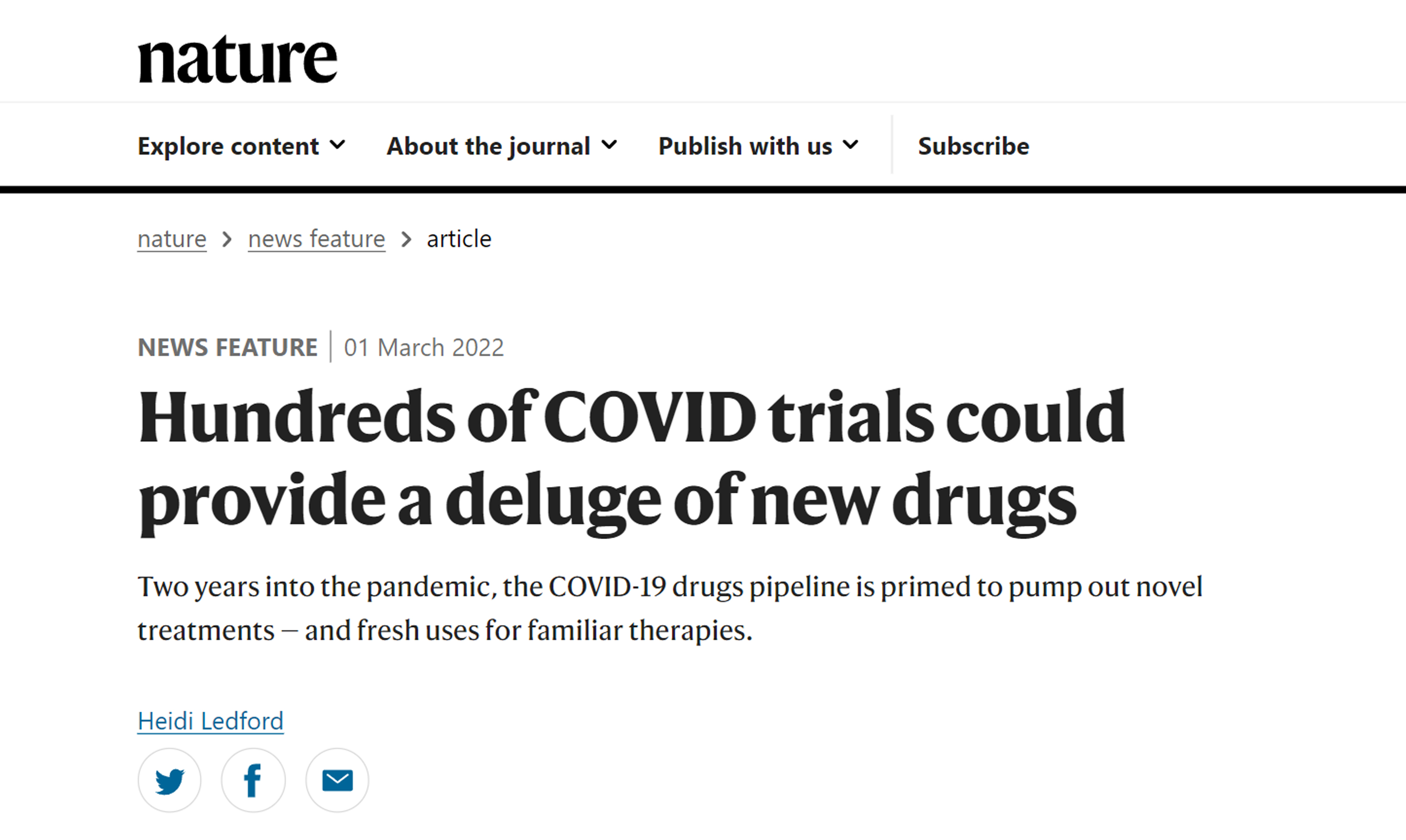 2022年3月1日,《Nature》刊出了題為“Hundreds of COVID trials could provide a deluge of new drugs”的新冠肺炎藥物研發專題報道(https://www.nature.com/articles/d41586-022-00562-0;Nature 603,25-27(2022);doi:https://doi.org/10.1038/d41586-022-00562-0)。