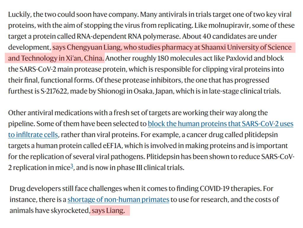 該報道采訪了包括美國國立健康研究院(NIH)Lawrence Tabak 、牛津大學Peter Horby等在內的5個知名新冠肺炎藥物研究團隊。我校陜西省生物醫藥重點產業鏈成果轉化創新團隊核心成員、食品與生物工程學院藥學系梁承遠副教授作為亞太地區唯一受訪者接受了《Nature》雜志25分鐘的電話采訪,回答了關于中藥在新冠肺炎治療中的應用,RNA依賴性RNA聚合酶(RdRp)和3CL蛋白酶(3CLpro)抑制劑各自優劣比較,新冠病毒治療藥物開發面臨的制約因素,新冠藥物開發的新靶標等問題。