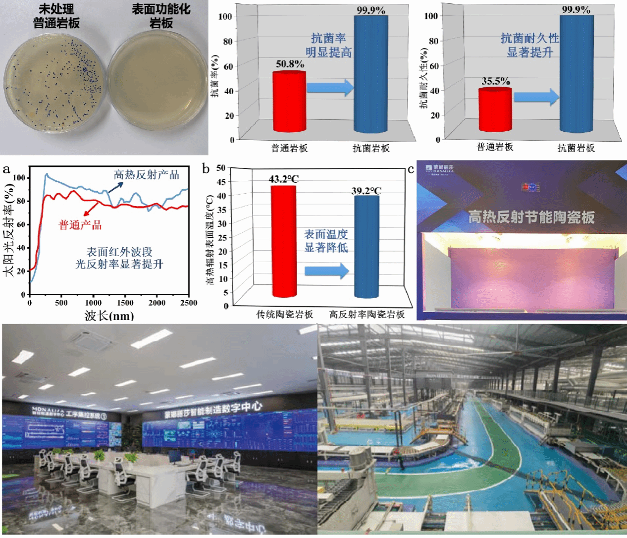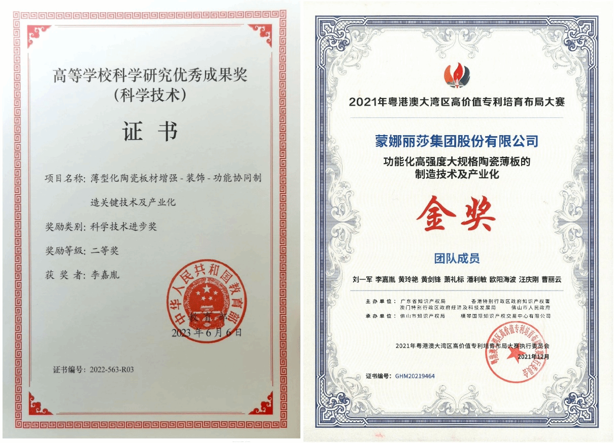 該團隊研發的高鋁超薄復合陶瓷巖板彎曲強度達到88Mpa、斷裂功超過290J/m2;通過高通透、低散射微晶熔體及功能性微晶負載技術,巖板可呈現透光率與透光波長可控、兼具遠紅外發射(發射率0.917)、抗菌(大腸桿菌抗菌率>99.9%)、高太陽光反射(>90%)等物理化學性質,巖板的功能化應用價值顯著提升;實現了表面釉的金屬光干粒包裹、高折射閃光粒可控分布和柔性模塊雙面拋等多個超薄陶瓷巖板的產業化自主制造技術,制造的3mm厚度大規格、高強度、多功能及高通透陶瓷巖板展現出高精準制造成品率(>99%)與優品率(>90%),技術應用后累計銷售額20.12億元,新增利潤總額5.05億元,新增稅收總額1.31億元,為建材行業節約資源、節能減排、綠色制造的樹立了典范效果。上述成果獲得教育部科技進步二等獎1項,粵港澳大灣區高價值專利布局大賽金獎1項。