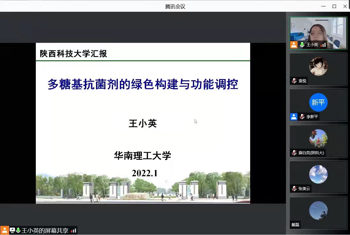 1月20日下午,應(yīng)我校輕工科學(xué)與工程學(xué)院、科技處及前沿院邀請(qǐng),華南理工大學(xué)王小英教授做客我校“前沿科學(xué)報(bào)告”,作了題為“多糖基抗菌劑的綠色構(gòu)建及功能調(diào)控”的線上學(xué)術(shù)報(bào)告。報(bào)告由輕工學(xué)院黨委書(shū)記李新平主持,學(xué)院部分教師及相關(guān)專業(yè)研究生參加了本次報(bào)告。