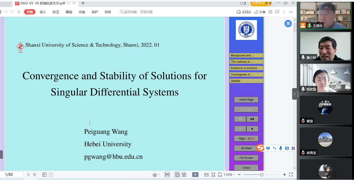 1月18日上午,應數學與數據科學學院邀請,河北大學副校長、教育部大學數學課程教指委委員王培光做客我校“前沿科學報告”,作了題為“Convergence for Singular Differential Systems with Maxima”的學術報告。副校長李學軍出席報告會,并在報告會之前線上與王培光副校長進行了交流。報告由數學學院院長藺小林主持,數學學院領導、全體教師和研究生參加了本次報告。