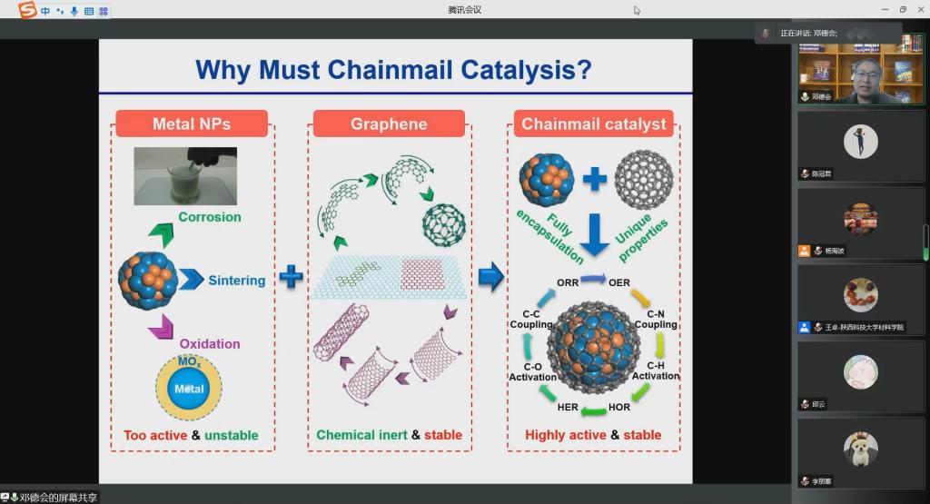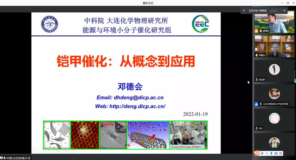 1月19日上午,應我??萍继?、前沿院和材料科學與工程學院邀請,大連化物所鄧德會研究員做客我校“前沿科學報告”,作了題為“鎧甲催化:從概念到應用”的線上學術報告。報告由教務處處長楊海波教授主持,材料學院部分師生參加了此次學術報告會。