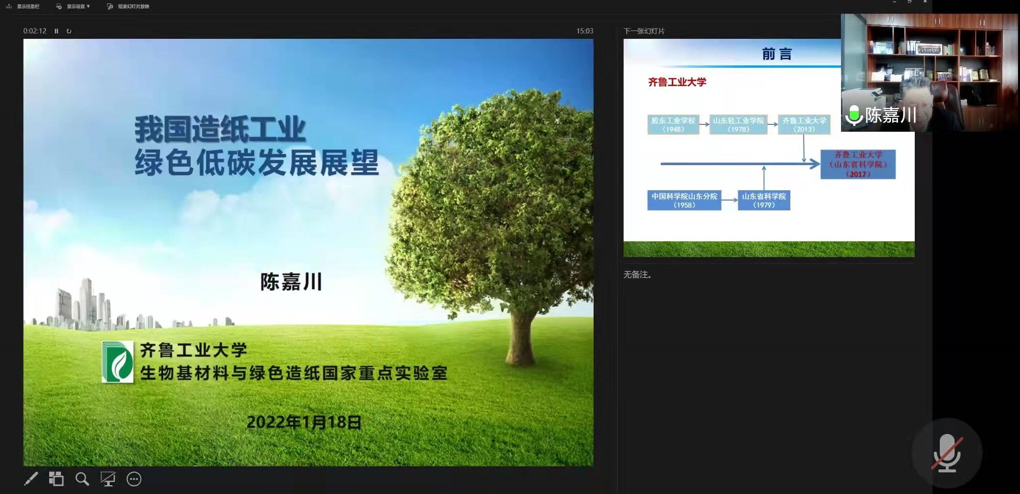 1月18日下午,受我校輕工科學與工程學院、科技處、前沿院邀請,齊魯工業大學陳嘉川教授做客我校“前沿科學報告”,作了題為“中國造紙工業綠色低碳發展展望”的線上學術報告。報告由輕工學院黨委書記李新平主持,學院教師及相關專業研究生參加了本次報告。