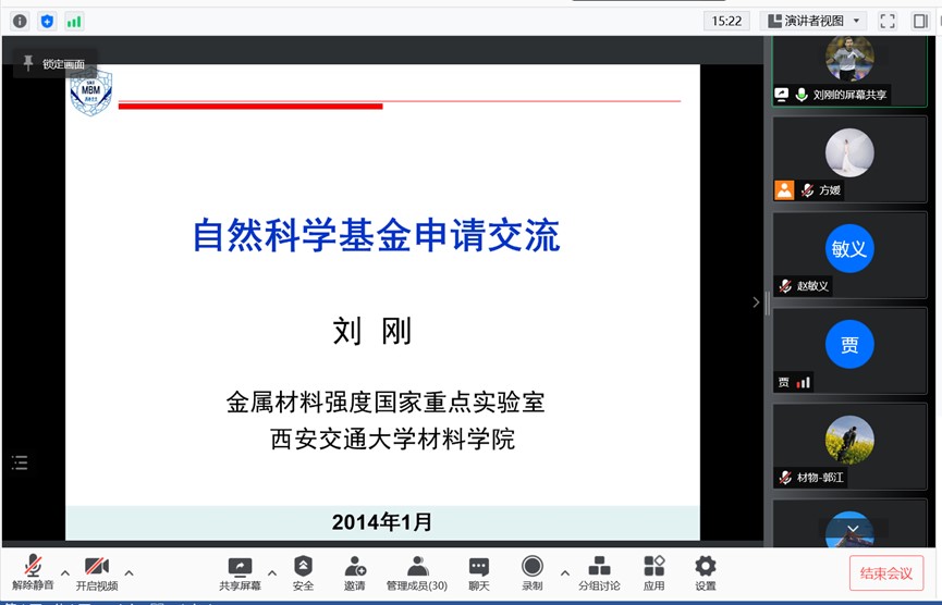 1月16日上午,應我校材料科學與工程學院邀請,西安交通大學劉剛教授做客我?!扒把乜茖W報告”,作了題為“國家自然科學基金申請的幾點體會”的線上學術報告。報告由材料學院院長朱建鋒教授主持,材料學院相關專業教師及部分研究生參加了此次報告會。