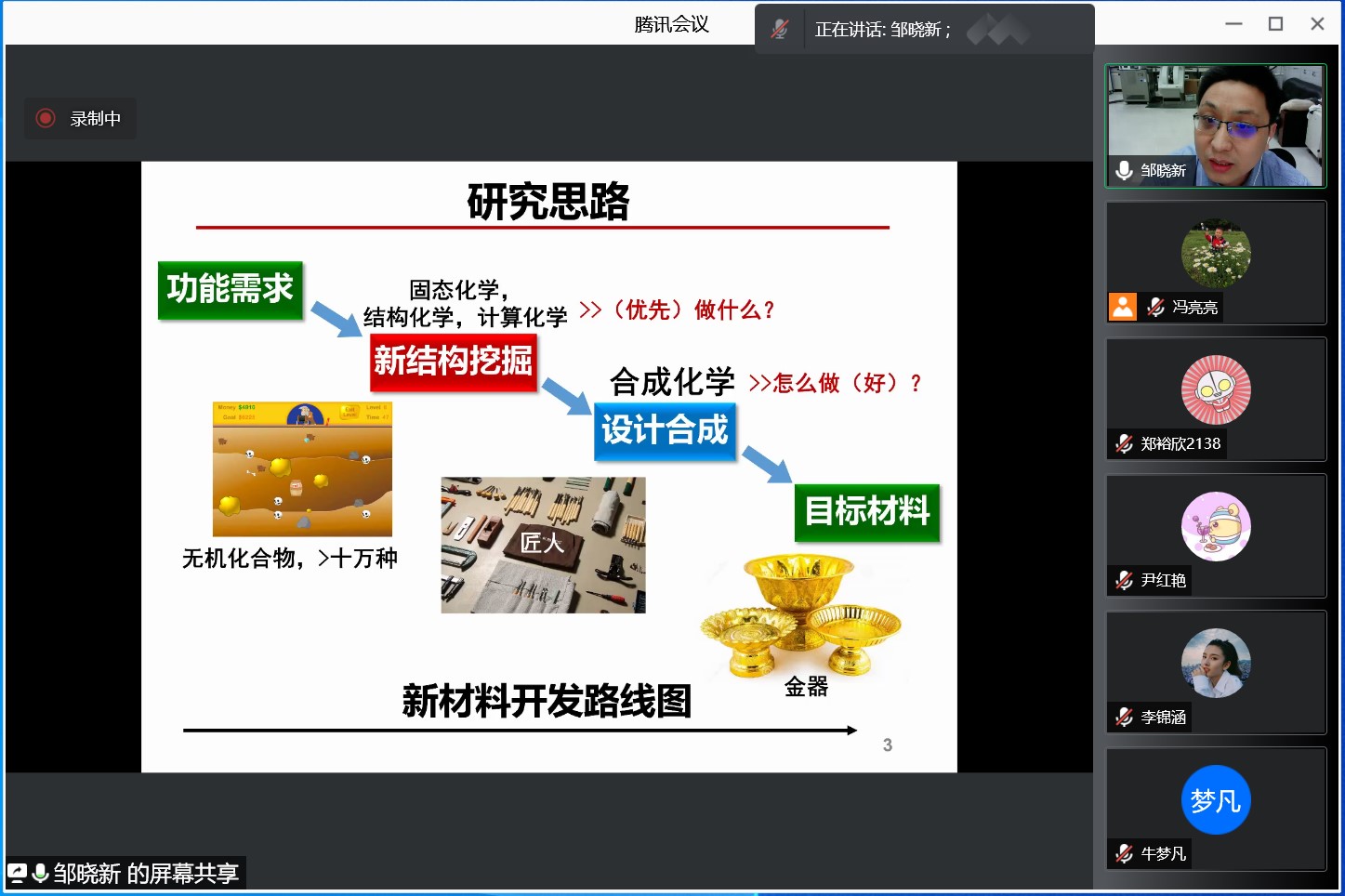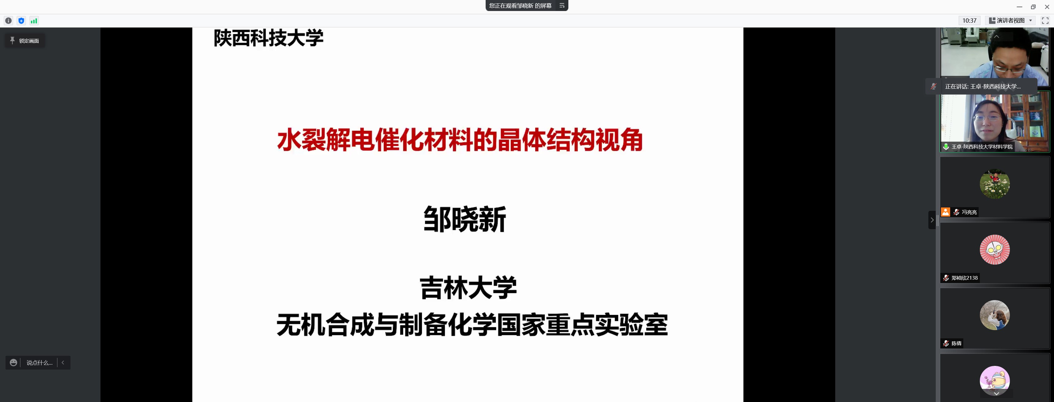 1月15日下午,應(yīng)我校材料科學(xué)與工程學(xué)院邀請(qǐng),吉林大學(xué)鄒曉新教授做客我校“前沿科學(xué)報(bào)告”,作了題為“水裂解電催化材料的晶體結(jié)構(gòu)視角”的線上學(xué)術(shù)報(bào)告。報(bào)告由材料學(xué)院副院長(zhǎng)王卓主持,我校部分教師及相關(guān)專業(yè)研究生參加了本次報(bào)告。