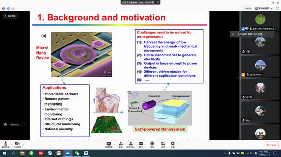 秦勇教授主要介紹了壓電納米發電機的設計及性能優化,和摩擦納米發電機方面最新的研究成果。報告現場氣氛熱烈,參會師生就感興趣的方面,與秦勇教授進行了熱切的交流。交流過程中,雙方都迸發出許多新的想法和火花,參會師生表示受益匪淺。