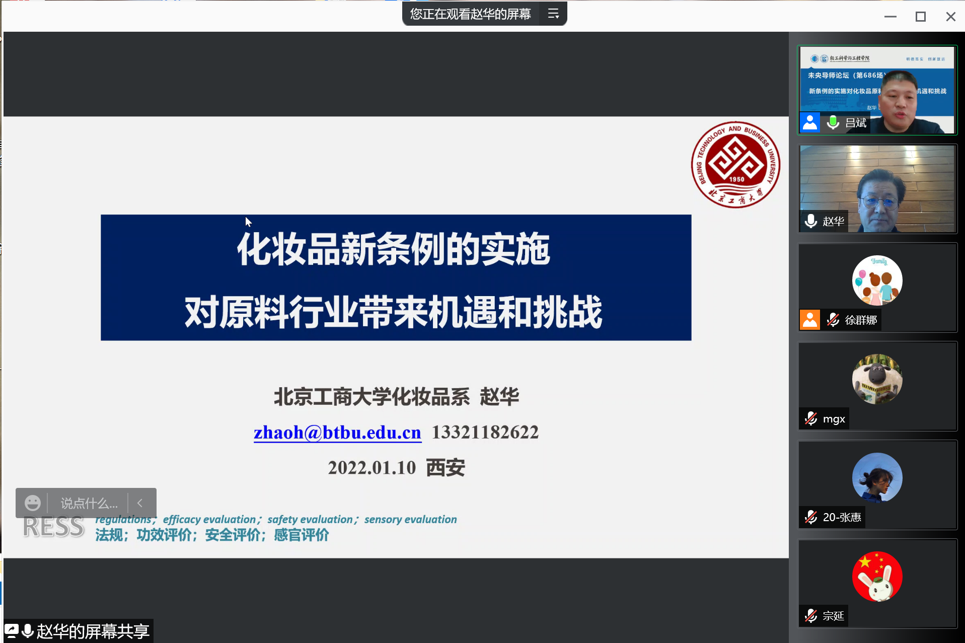 1月10日上午,應我校輕工科學與工程學院和研究生院邀請,北京工商大學趙華教授做客我校“未央導師論壇”,并作了題為“新條例的實施對化妝品原料行業帶來的機遇和挑戰”的報告。報告由輕工學院院長呂斌教授主持,學院相關教師和學生參加了本次報告會。受疫情影響,本次報告采取線上會議方式進行。