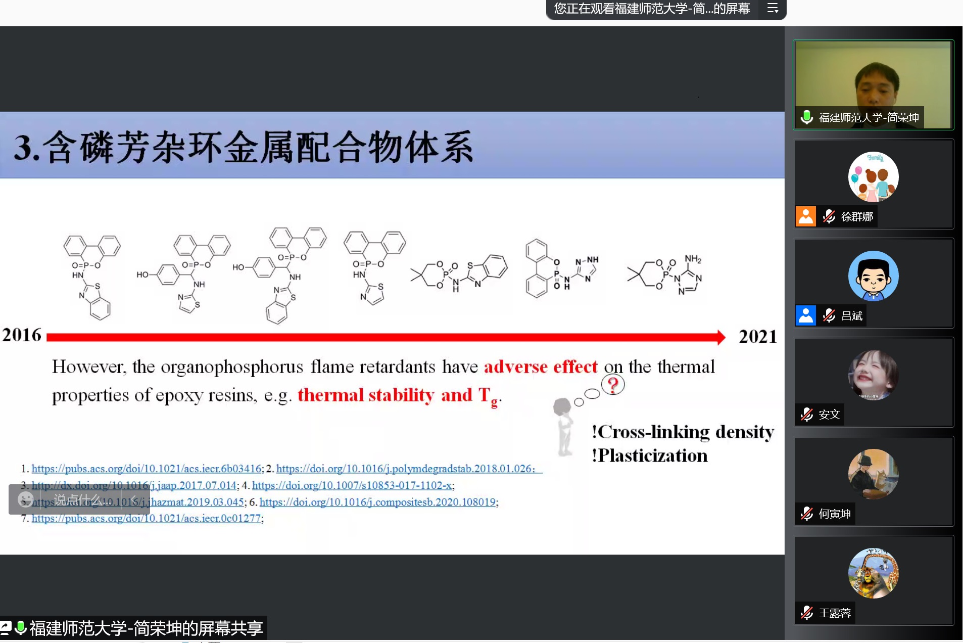 1月5日上午,受輕工科學(xué)與工程學(xué)院、科技處及前沿院邀請(qǐng),福建師范大學(xué)簡(jiǎn)榮坤教授做客我校“前沿科學(xué)報(bào)告”,作了題為“環(huán)氧樹(shù)脂阻燃改性進(jìn)展”的線上學(xué)術(shù)報(bào)告。輕工學(xué)院部分教師及研究生聆聽(tīng)了本次報(bào)告。報(bào)告由輕工科學(xué)與工程學(xué)院院長(zhǎng)呂斌主持。