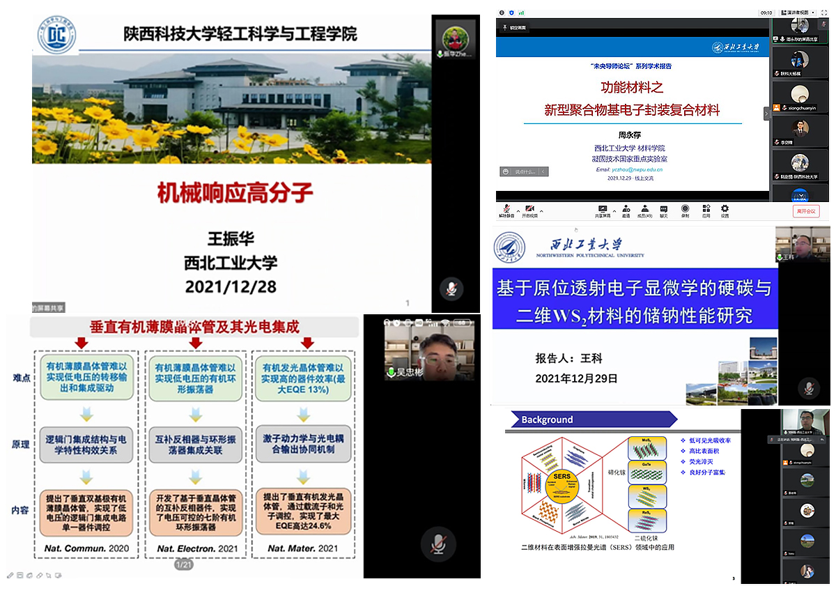 12月28、29日,應輕工科學與工程學院和研究生院邀請,西北工業大學柔性電子研究院吳忠彬教授、王振華副教授、王科副研究員和西北工業大學材料科學與工程學院周永存副教授和黨阿磊副教授做客我校“未央導師論壇”,為學院師生作了線上系列學術報告。報告會由輕工學院教師熊傳銀副教授主持。