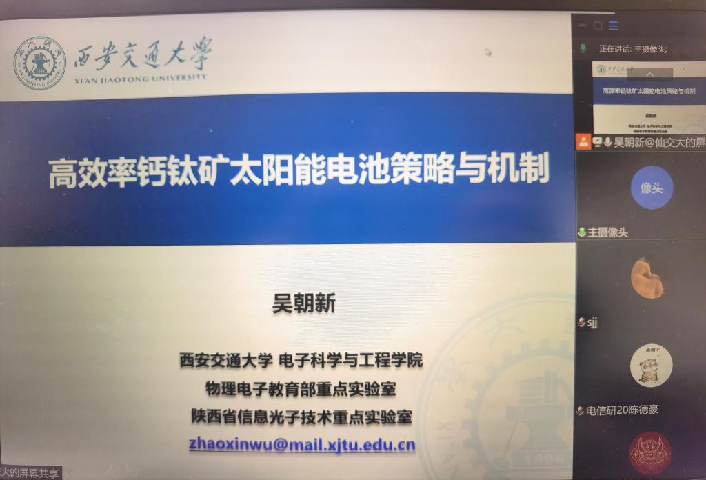 12月17日上午,應科技處、前沿院與電子信息與人工智能學院邀請,西安交通大學吳朝新教授在我校實驗樓2B211作了題為“有機無機復合鈣鈦礦界面與晶體調控及其高性能光伏器件”的前沿學科報告。電智學院部分教師及相關專業研究生參加了本次報告,報告由電智學院主任張方輝教授主持。因疫情影響,本次報告采取線上線下的方式同步進行。