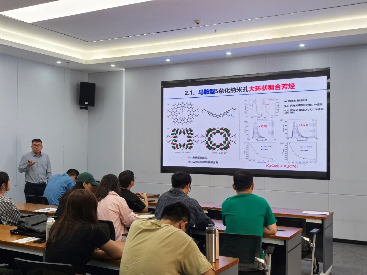 環狀稠合芳烴作為一類新型的有機光電磁半導體材料,由于其獨特的電子和空間幾何結構特征而有望在有機光電子器件和超分子傳感檢測等領域獲得突破性應用,其中主要的挑戰是環狀稠合芳烴的化學濕法精準合成困難,光電功能探索欠缺。在報告中陸雪峰教授詳細介紹了構建幾何結構可控的環狀稠合芳烴新方法及其分子幾何結構、超分子組裝、聚集態結構、陰離子檢測和載流子傳輸性能的構效關系。與會師生熱情的與陸雪峰教授進行了交流探討,本次學術交流活動圓滿成功。