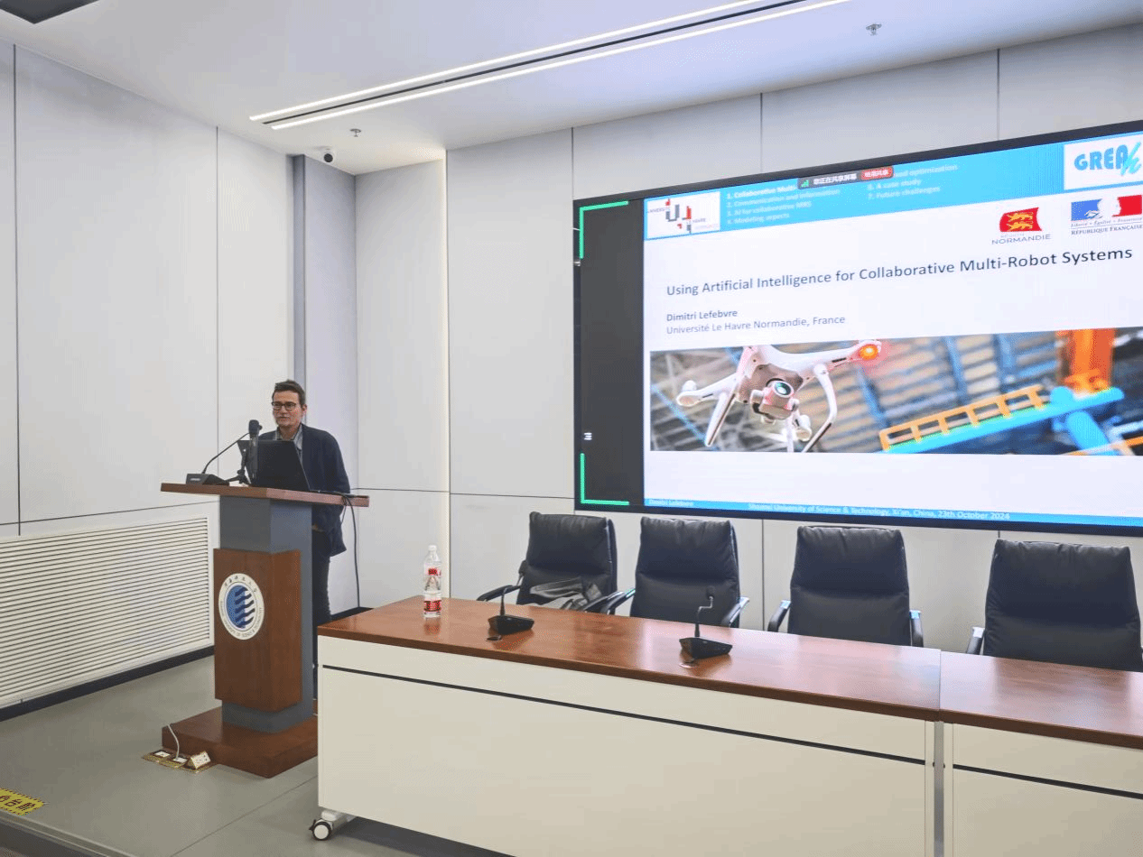 10月23日下午,應我校電氣與控制工程學院邀請,法國勒阿弗爾大學Dimitri Lefebvre(迪米特·列斐爾)教授作了題為“Using Artificial Intelligence for Collaborative Multi-Robot Systems(人工智能在協作式多機器人系統中的應用)”的學術報告。報告會由研究生院主辦,電氣與控制工程學院承辦,電控學院研究生導師及研究生參加了此次報告會,會議由電控學院副院長何舟主持。