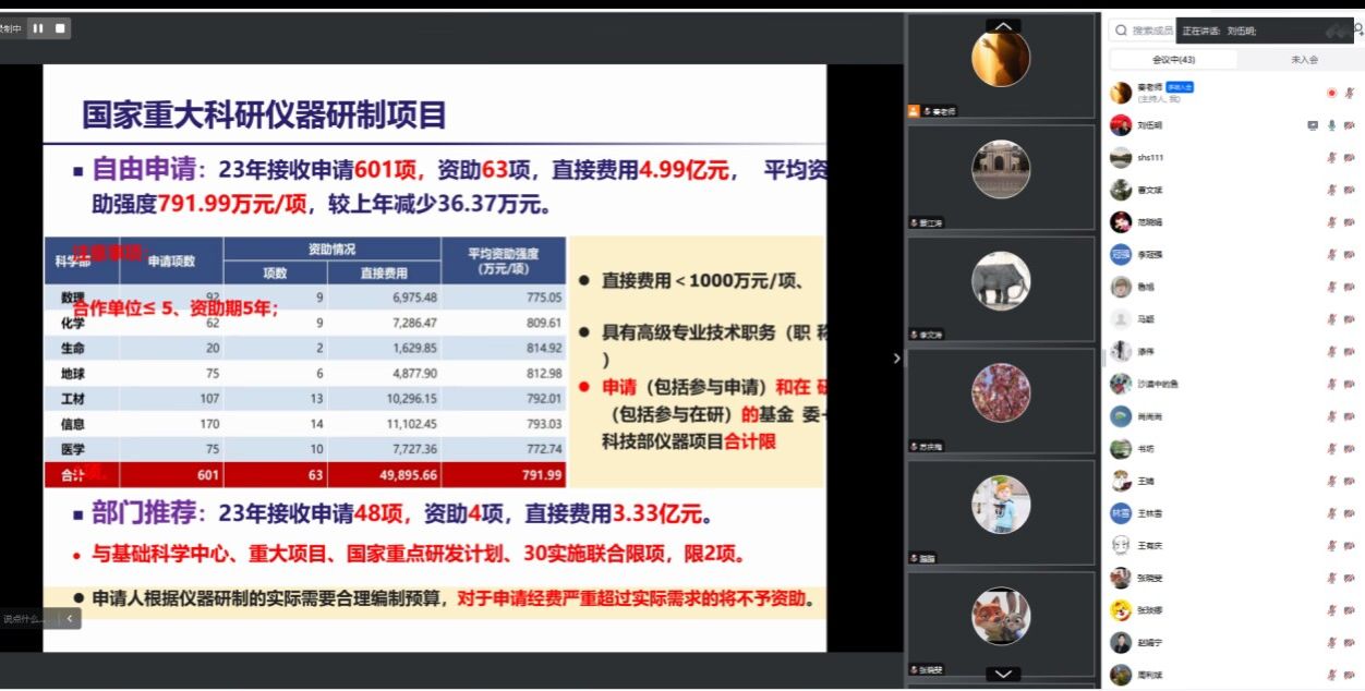隨后,劉伍明研究員介紹了2025年國家自然科學基金項目資助體系、評審政策及申報書內容撰寫的注意事項。針對如何精準凝練研究目標、科學問題,如何合理設計研究方案和技術路線,如何清晰展示預期成果和對社會的潛在貢獻做了詳細簡介。并就教師申報過程中關注的問題做了充分交流。