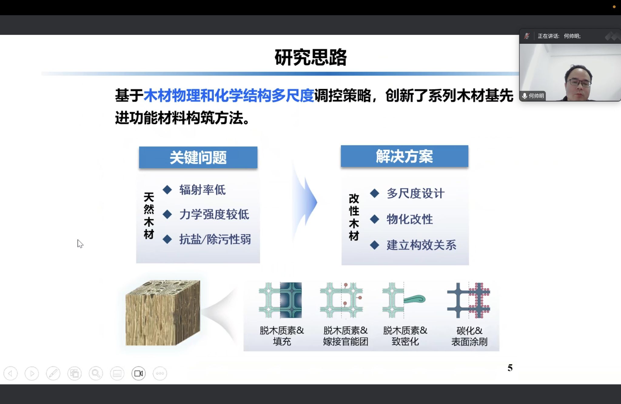 何帥明教授詳細講解了木材的組分和精細結構以及相應的物理化學特性。這些特性為木材在結構和組分上的創新設計和改性提供了堅實的基礎。然而,如何利用木材的層級結構來提升其固有性能或賦予其新的功能,進而開發出高性能的節能環保新材料,一直是研究中的難點所在。針對上述挑戰,何帥明教授提出了從微觀到宏觀的多尺度結構設計新方法,以開發基于木材的節能環保材料,這種方法通過物理和化學改性系統地調控木材的特性,并建立了木材基節能環保新材料的結構與性能之間的關系,實現對木材的物理和化學性質(如力學、光學、熱學和電學性能)的精確調控,并率先闡明了新型節能環保材料的輻射制冷和抗鹽沉積等關鍵工作機制,為通過設計節能環保新材料來減少對資源和環境的影響提供了理論和實驗支持,為構建高性能的纖維素基節能環保新材料奠定了科學基礎。