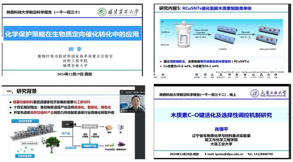 應我校輕工科學與工程學院(柔性電子學院)、科技處及前沿院邀請,福建農林大學帥李教授、廣西大學聶雙喜教授和大連工業大學肖領平教授分別在近日做客我校“前沿科學報告”活動,開展了題為“化學保護策略在生物質定向催化轉化中的應用”、“紙基摩擦電材料構筑及應用”和“木質素C-O鍵活化及選擇性調控機制研究”的線上學術報告。輕工學院相關專業教師和研究生參加了報告會。