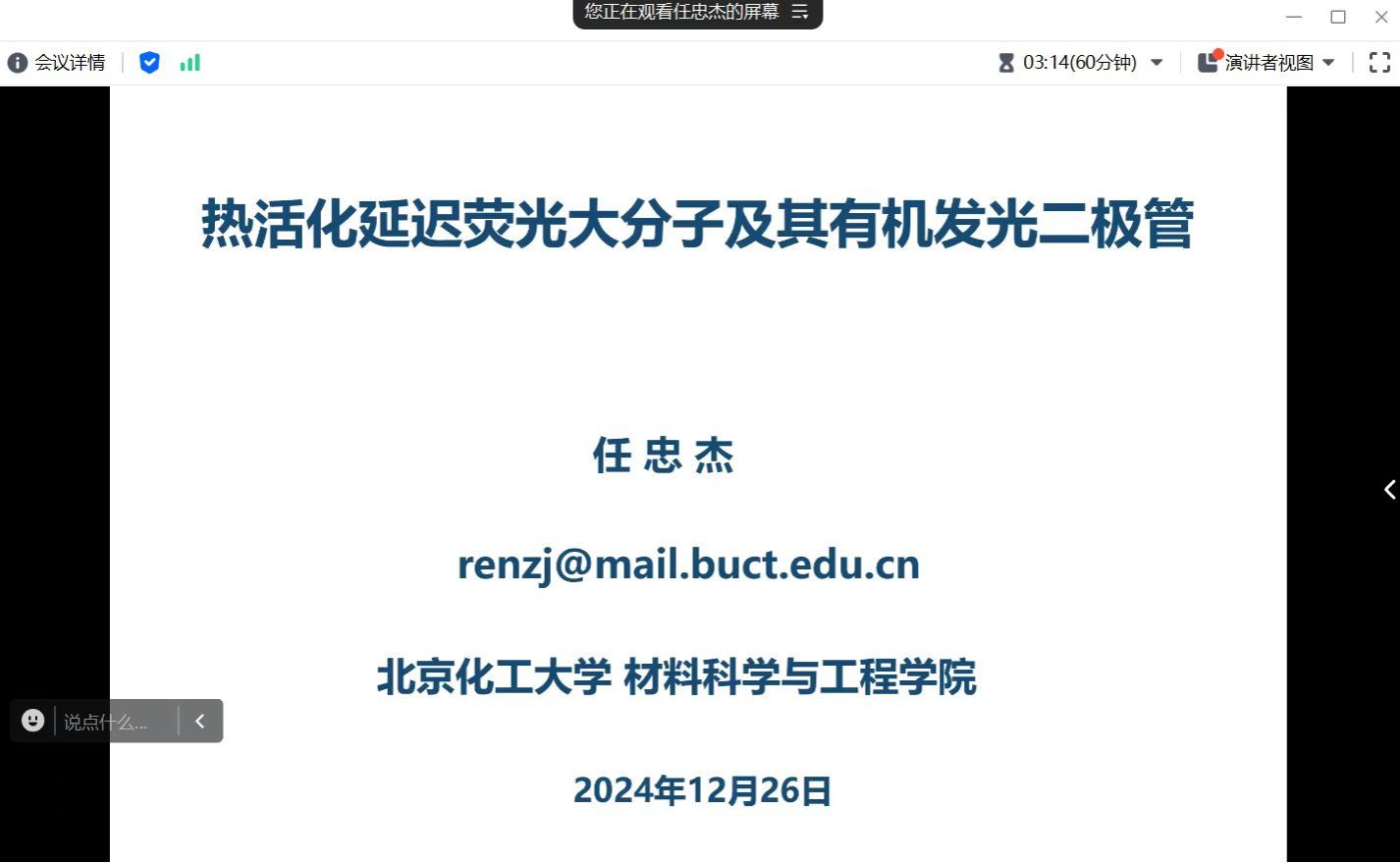 報告結束后,任忠杰教授與參會師生就TADF單元引入鹵化受體調控三重激發態的局域態占比等問題進行了深入討論。此次前沿報告的舉行,加深了與會師生對不包含重金屬的熱活化延遲熒光(TADF)材料領域的研究和發展趨勢的認識,激發了研究生的創新熱情并拓寬了研究思路。
