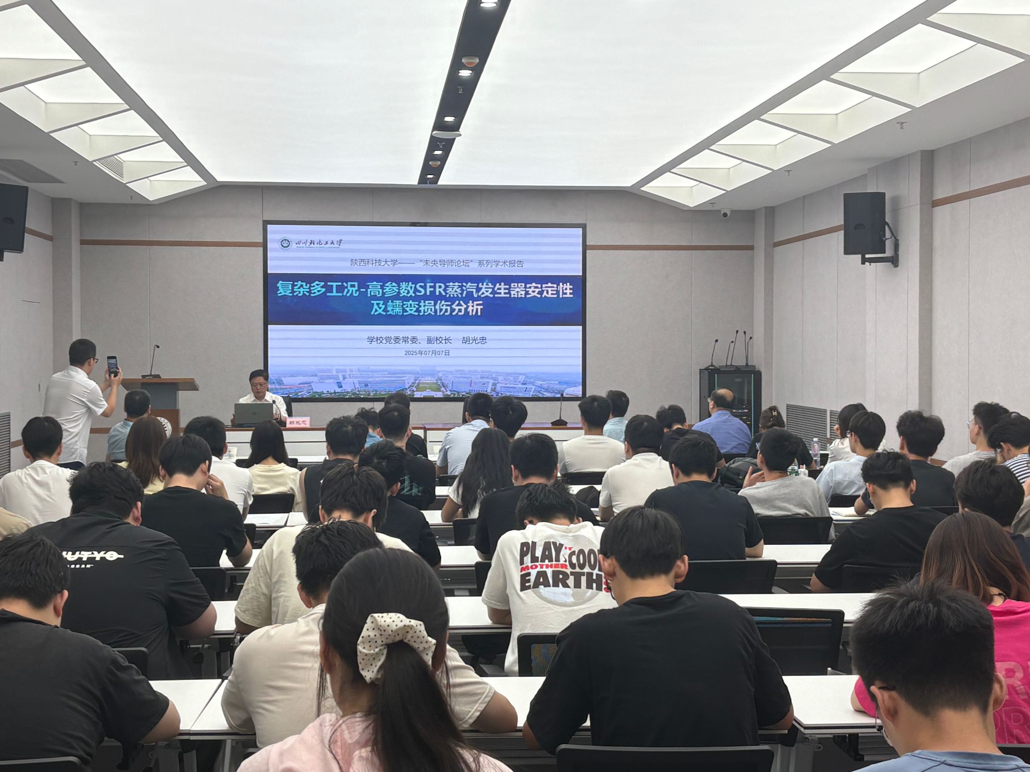 7月7日,應研究生院和機電工程學院(智能制造與機器人工程學院)邀請,四川輕化工大學副校長胡光忠教授做客我校“未央導師論壇”,作了題為“復雜多工況-高參數SFR蒸汽發生器安定性及蠕變損傷分析”的學術報告,報告會由研究生院院長強濤濤教授主持,機電學院院長楊立軍、副院長袁越錦及學院相關專業教師和研究生參加了本次報告會。