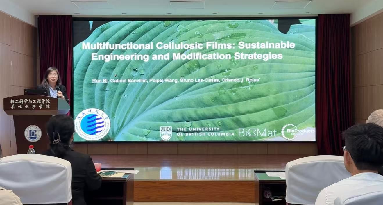UBC畢然研究員介紹了具有定制功能的纖維素基薄膜創新制備策略,包括物理結構構建、化學改性和廢棄物再利用。展示了木質纖維素在設計高性能、多功能材料方面的靈活性。UBC吳杰博士后介紹了通過生物煉制技術從木質纖維素中獲取可持續生物產品的方法,并對生物精煉技術未來在提升轉化效率、降低成本及推動產業化應用的發展展開了探討。中國科學院過程研究所盧翊研究員圍繞可再生資源高效轉化與綠色制造的前沿方向,闡述了如何利用生物質組分膠體間非共價相互作用構筑和利用非平衡態液液界面等。為開發兼具高效轉化率與高附加值的綠色新材料體系提供新理論方向與技術路徑。東北林業大學宦思琪教授通過利用界面工程策略,從富含羥基和復雜網絡結構的纖維素和木質素(生物聚合物)中通過液/液界面實現自組裝,形成乳液膠體,設計并制備出了多維功能材料。克服了一維材料中協同結構-功能設計的長期難題。